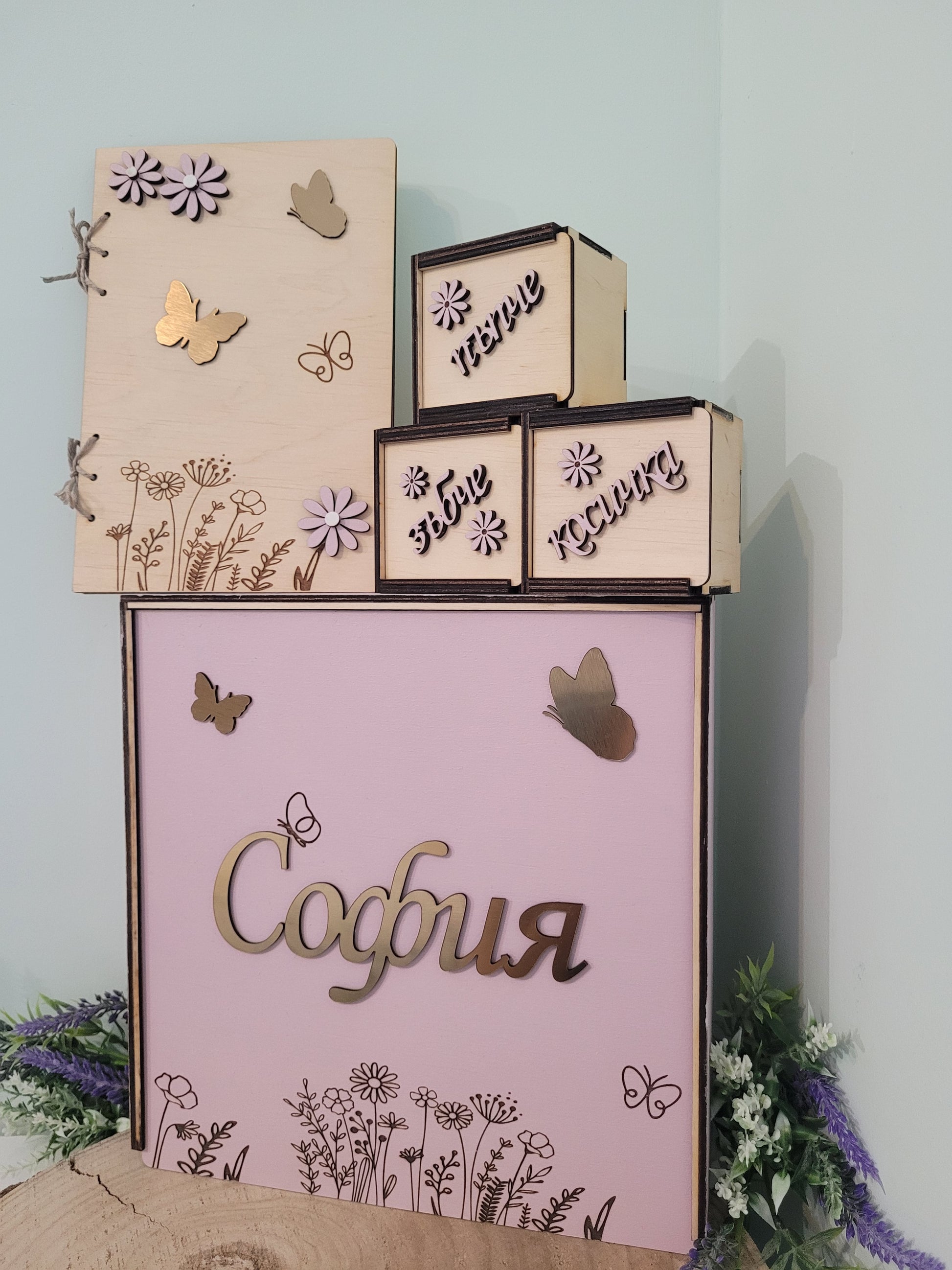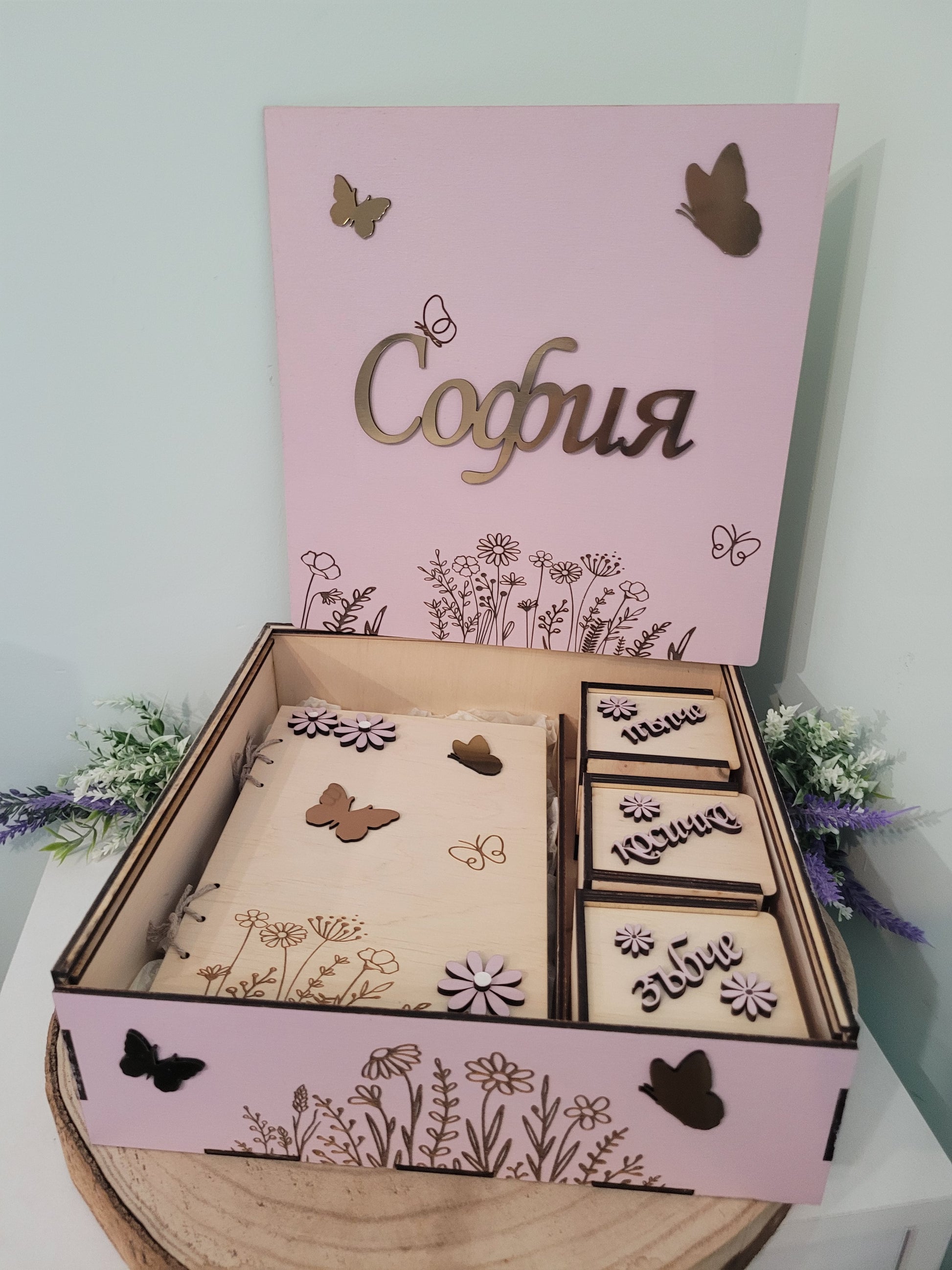 Съхранете най-ценните мигове от първите години на вашето момиченце с тази изящна персонализирана дървена кутия за спомени. Създадена с любов, тя пази най-скъпите неща – пъпче, първо зъбче и гривничка от родилното, превръщайки се в нежен символ на семейството и любовта.