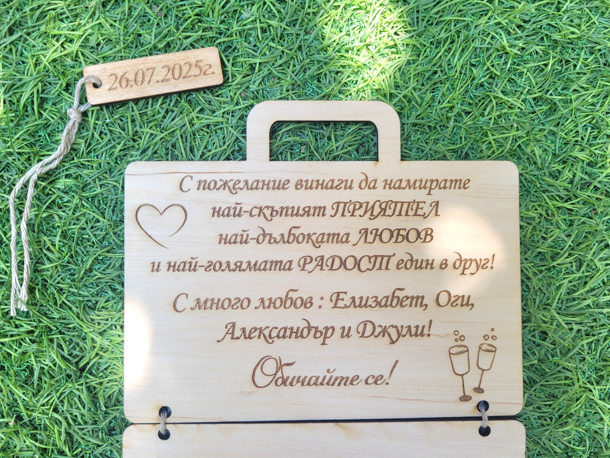 Всеки комплект е лазерно гравиран върху брезов шперплат, фино изработен и красиво опакован, готов за подаряване. Можете да добавите име, дата или кратко послание, за да направите подаръка още по-личен.