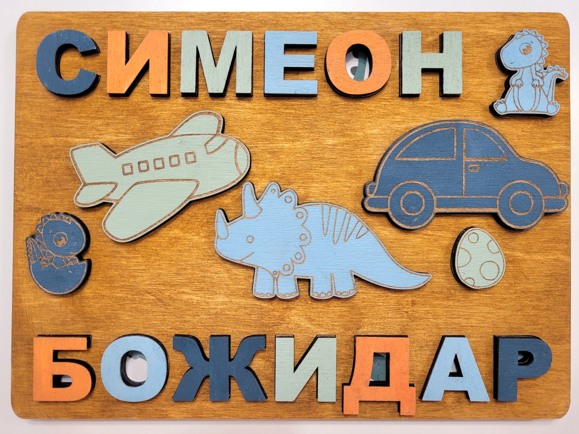 Персонализиран дървен пъзел, създаден да подпомага развитието на децата чрез игра. Пъзелът включва две имена и различни форми, които насърчават разпознаването на букви, цветове и форми по забавен и интерактивен начин. Комбинира ученето и играта, като създава лична връзка чрез персонализацията.