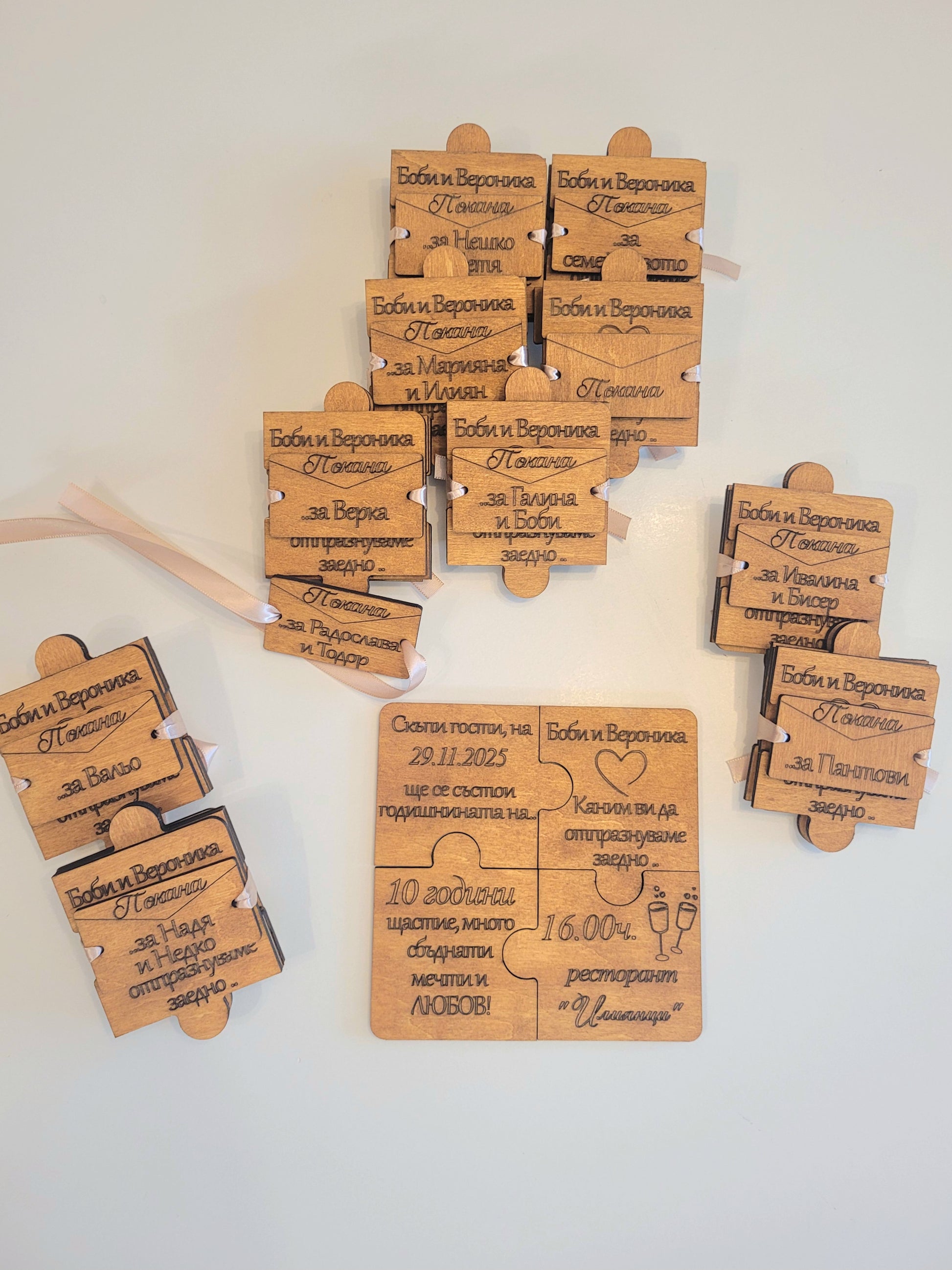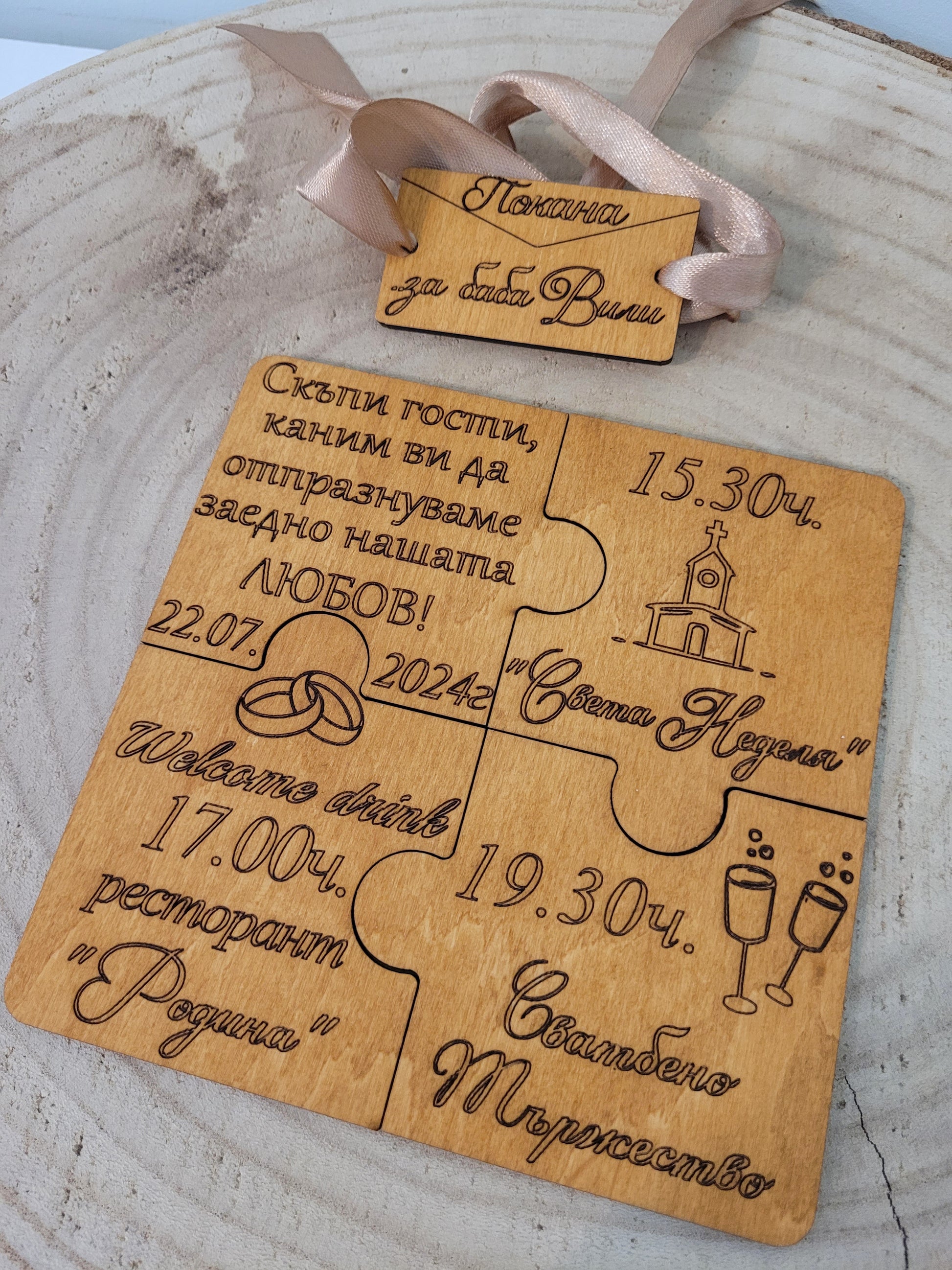 Дървена сватбена покана тип пъзел – Изцяло персонализирана